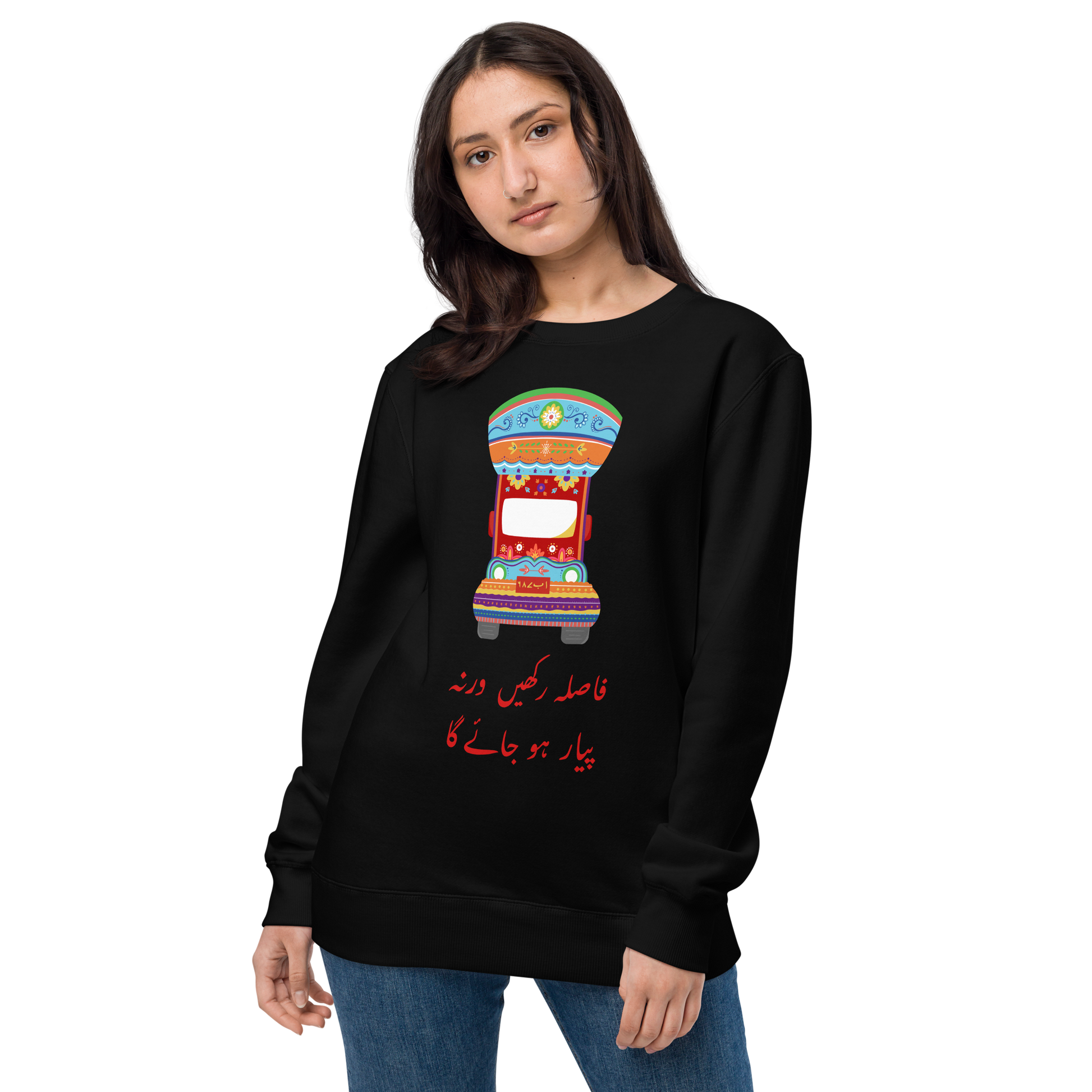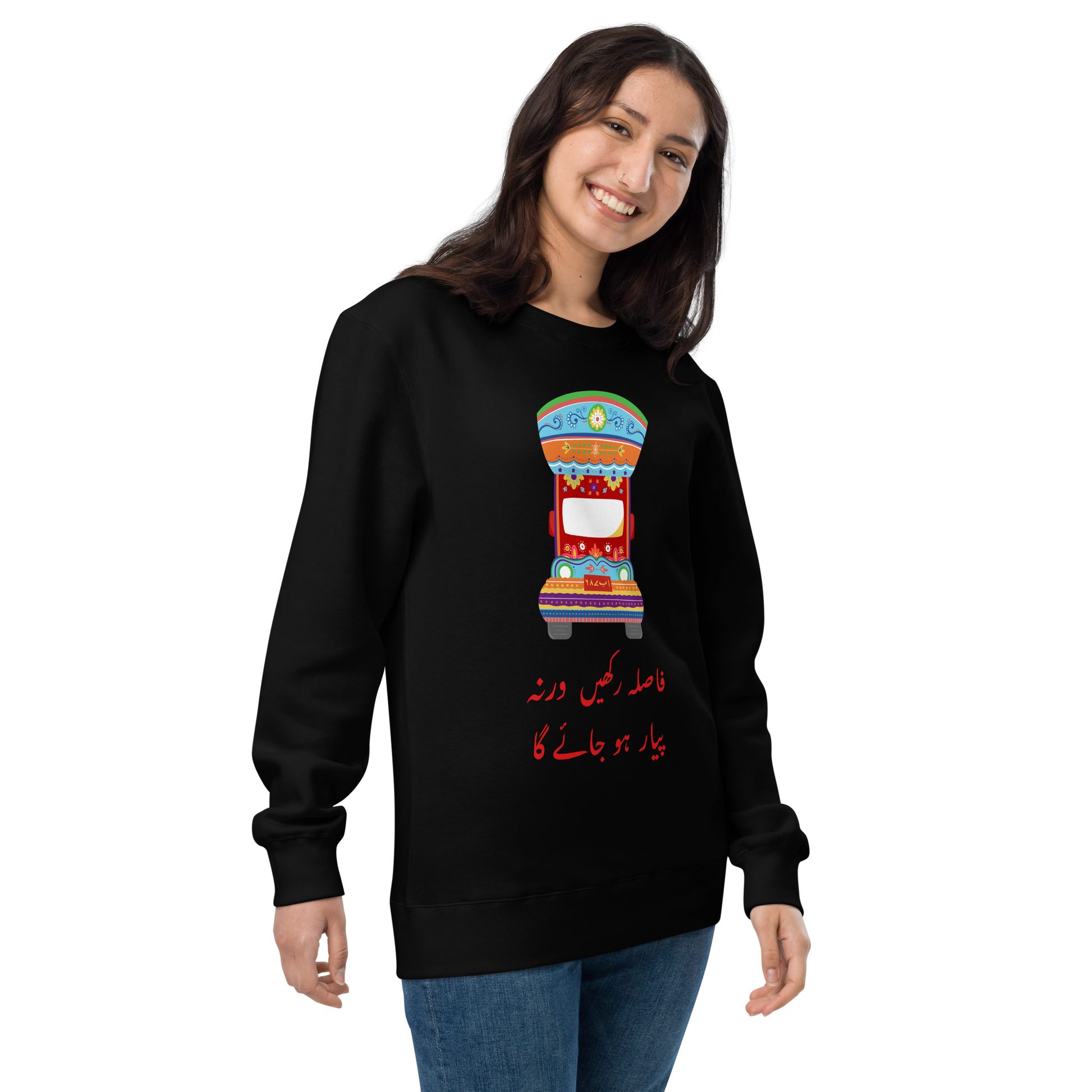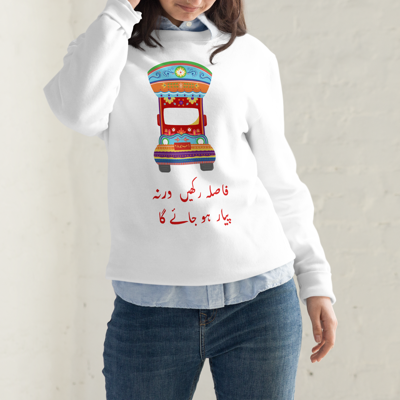 Inspired by beautiful Pakistani Truck Art, this piece of wardrobe is for sure gonna be your next favorite everyday wearable! With the classic urdu truck quote "Fasla Rakhein Warna Pyar Hojaega (Keep distance else you'll fall in love), this Pakistani truck art sweatshirt is a perfect way to represent your roots while looking chic!