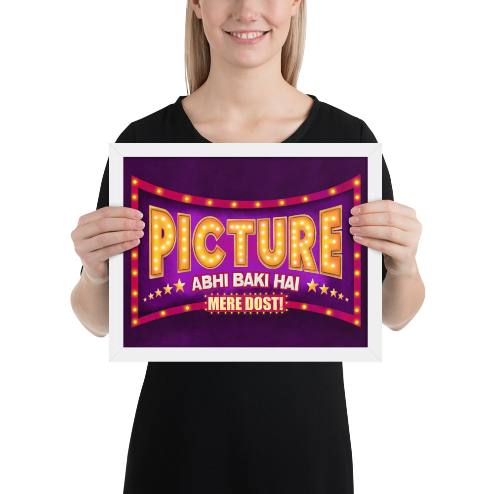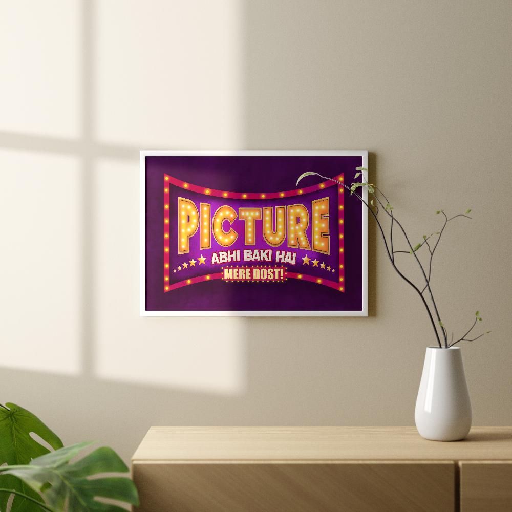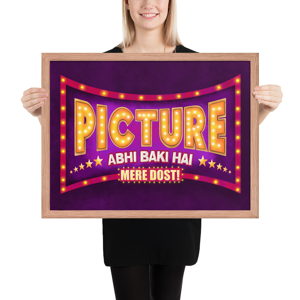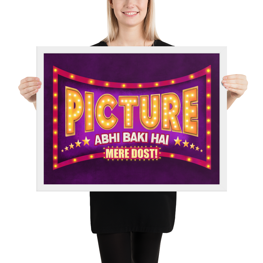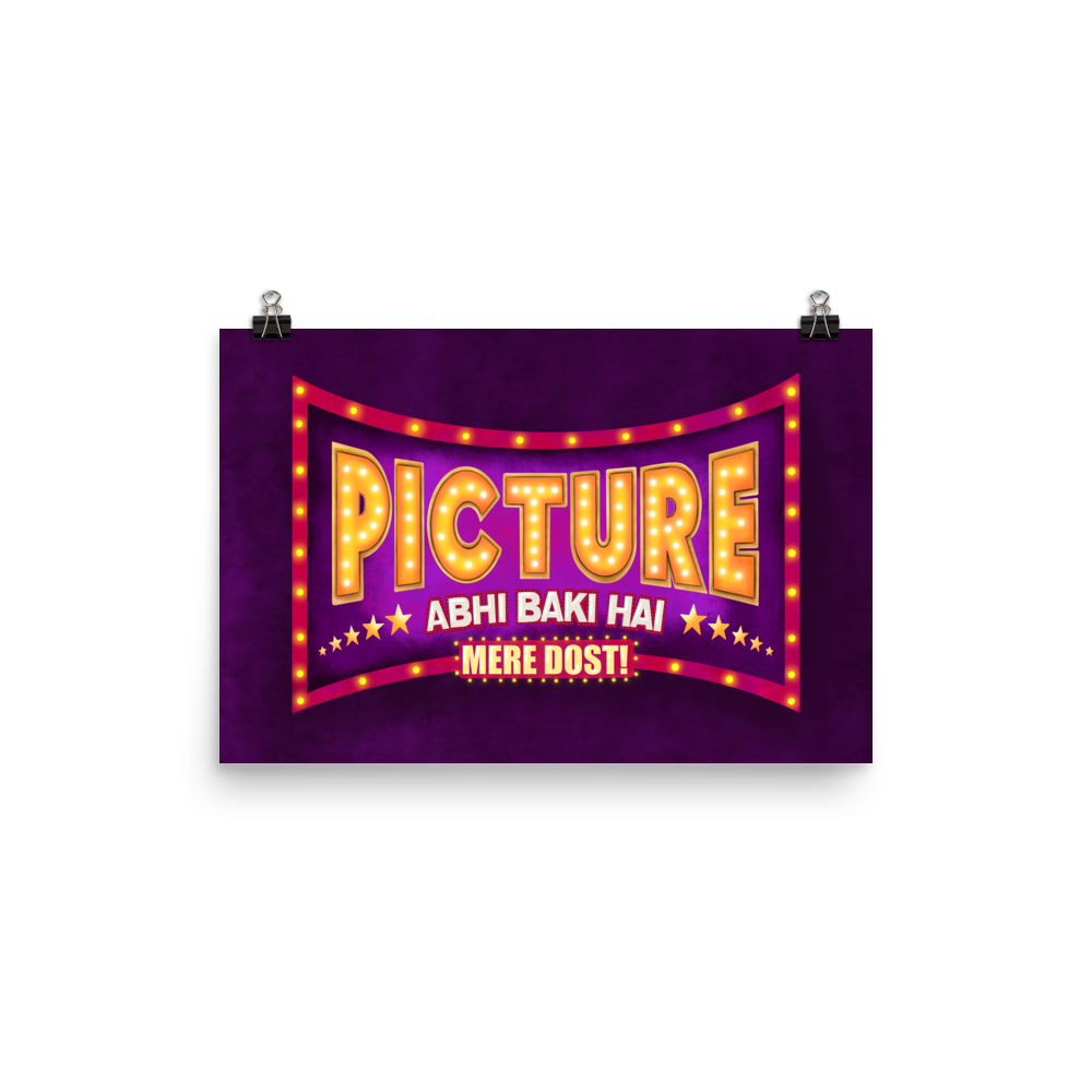 If you're looking for a fun Indian Bollywood style Wall Art to revive your space's aesthetics then look no further. This beautiful and colorful desi pop art that says "Picture Abhi Baki Hai Mere Dost!" not only is gonna change the whole look of your space but will also be the motivating and inspiring wall art you need!