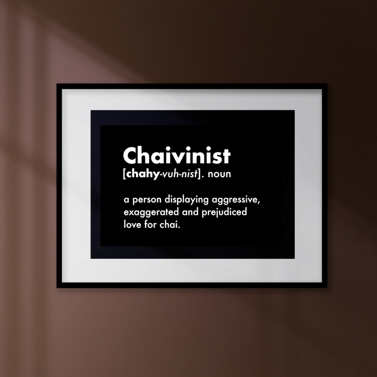 Show off your chaivinist spirit with this eye-catching poster! This stylish wall art features a fun definition of a “Chaivinist” and is perfect wall art to celebrate the love of Chai in your life. More than just a simple and minimal Chaivinist definition, this poster celebrates the rich South Asian culture around this wonderful beverage and will spruce up any wall. So don’t delay, show your Chaivinist pride today!