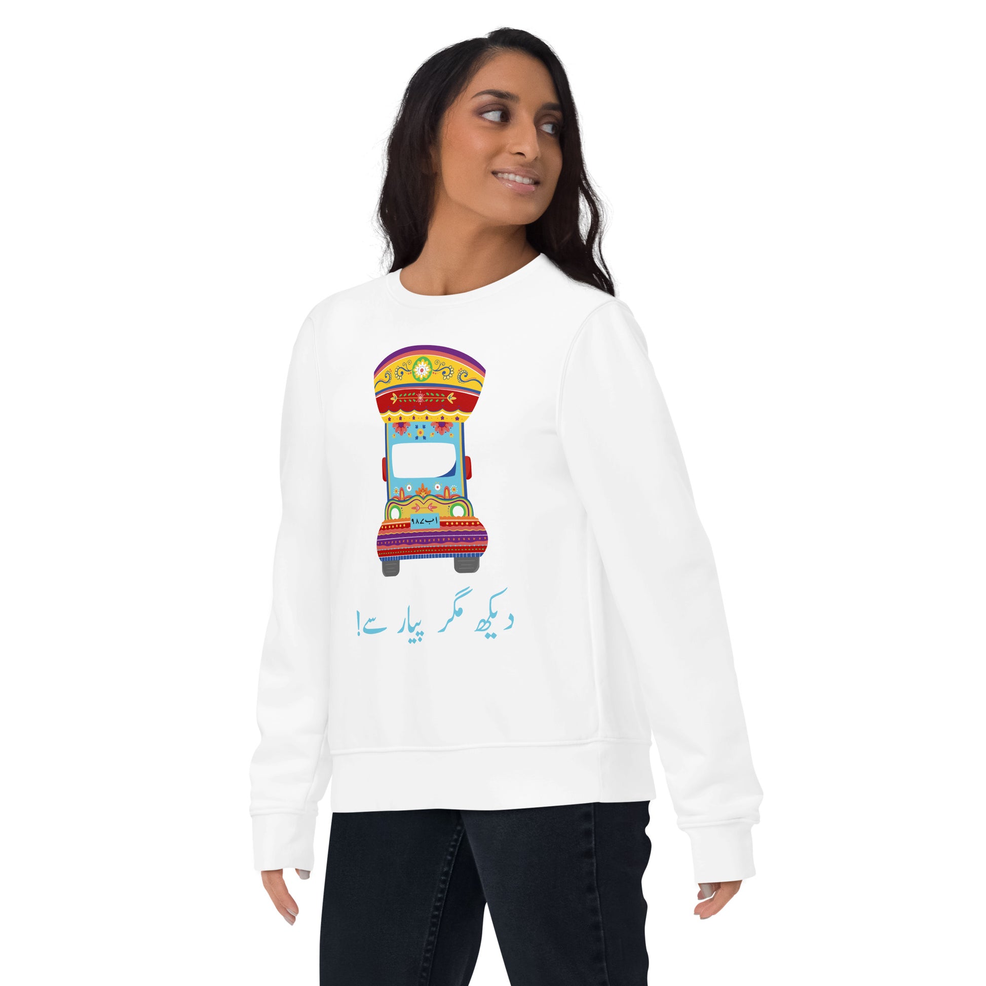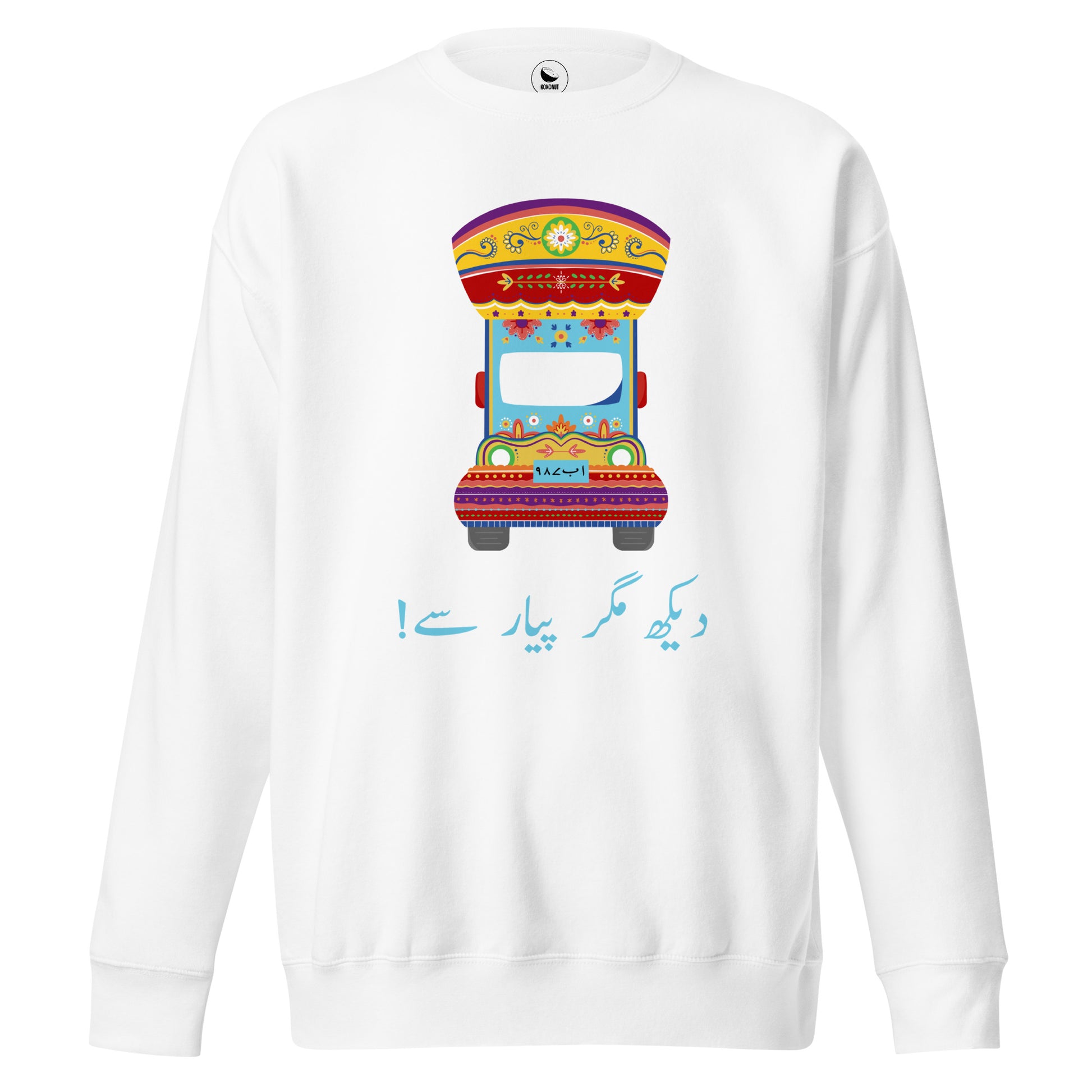 Inspired by phenomenal Pakistani Truck Art, this piece of wardrobe is for sure gonna be your next favorite everyday wearable! With the classic urdu truck quote "Dekh Magar Pyar Se (Look but with love), this Pakistani truck artĀ sweatshirt isĀ a perfect way to represent your roots while looking chic!
