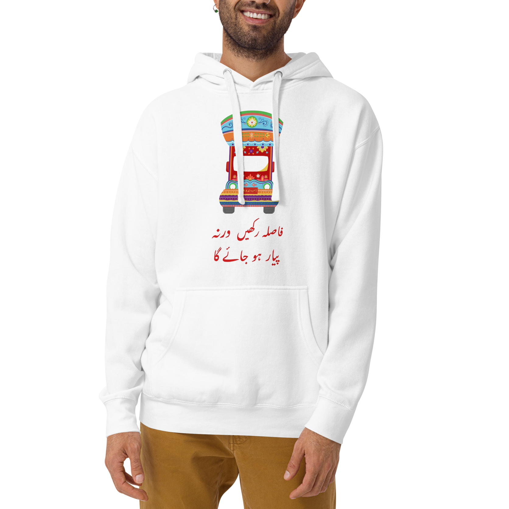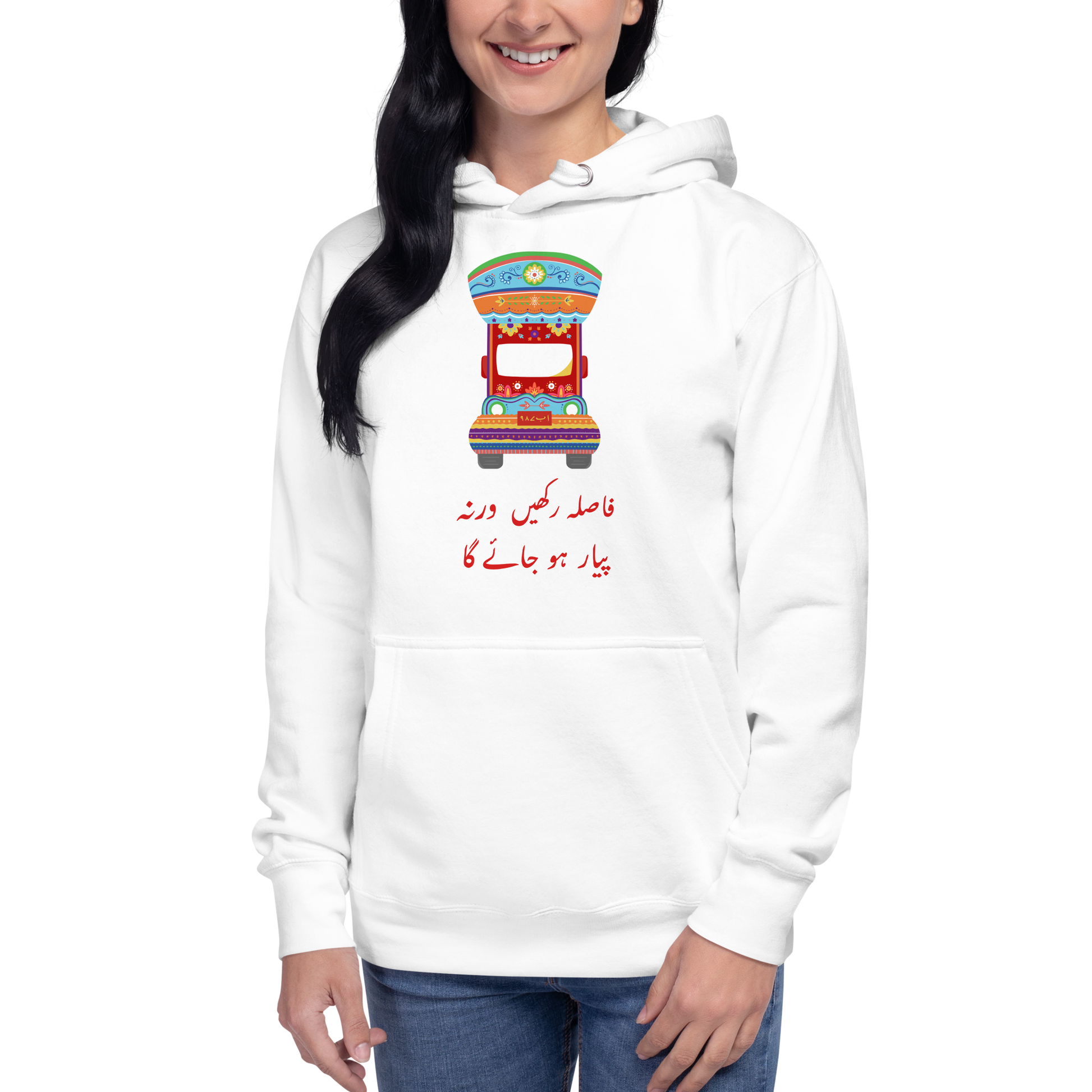 Inspired byĀ beautiful Pakistani Truck Art, this piece of wardrobe is for sure gonna be your next favorite everyday wearable! With the classic urdu truck quote "Fasla Rakhein Warna Pyar Hojaega (Keep distance else you'll fall in love), this Pakistani truck art hoodie isĀ a perfect way to represent your roots while looking chic!